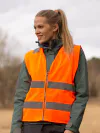 Refleksvest til voksen i neon orange med personlig navnetrykk, perfekt for økt synlighet i barnehage, skole og på tur. Vesten har glidelås i front, noe som gjør påkledningen enkel.